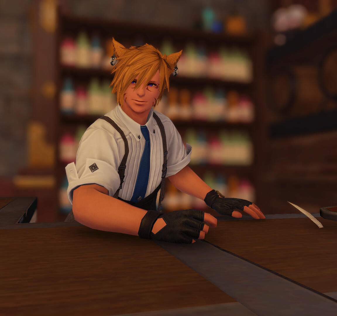 A'shyr Tia is a Miqo'te Seeker of the Sun born to a Lominsan blacksmith and his wife. He learned the smithing trade from his father, who had previously left the A tribe to pursue his craft. Inspired his whole life by his father's dedication to his craft, A'shyr strives for excellence in anything he tries with earnest. This drive, paired with a love of the tales of adventure shared by his father's customers, inspired a young A'shyr to pursue the life of an adventurer and treasure hunter. Through his adventures, he hopes to discover new or lost smithing and combat techniques to hone his skills, and to become worthy of remembrance for generations, alongside his friends and colleagues.